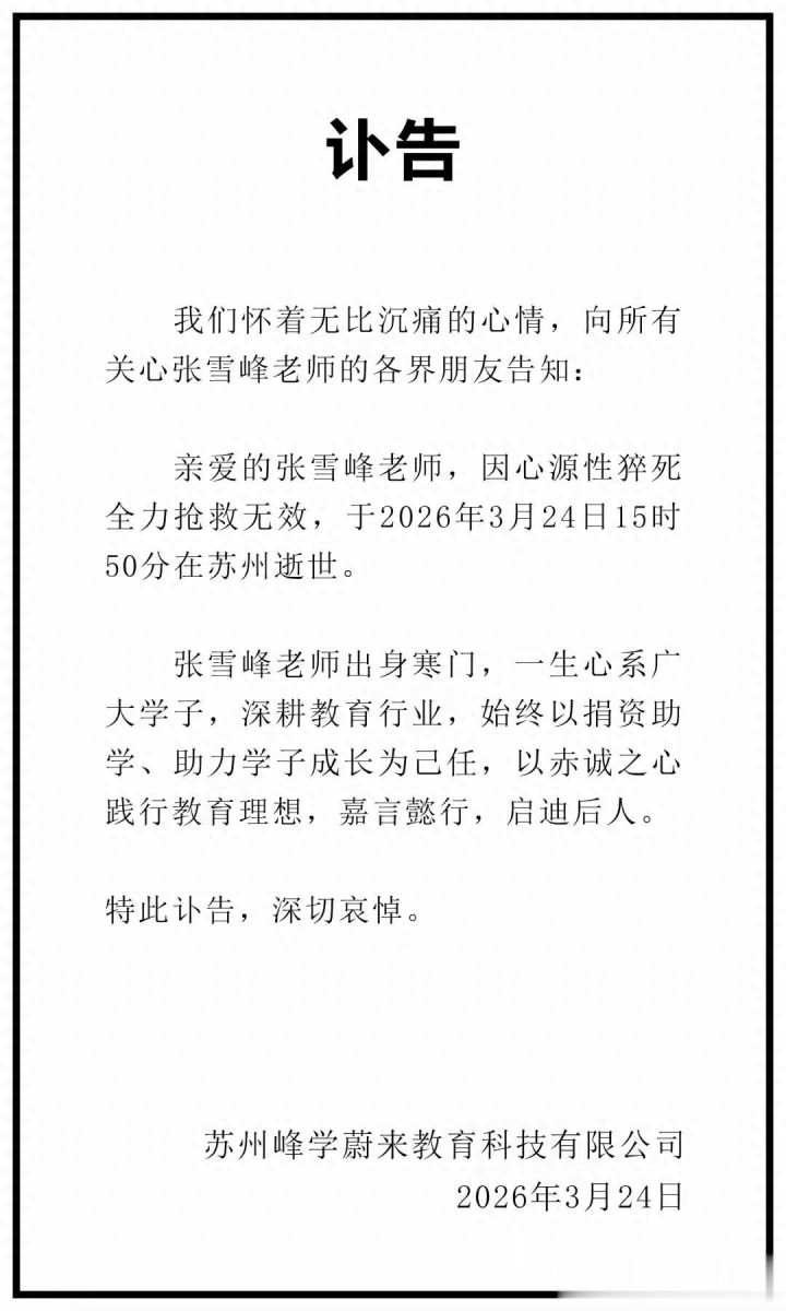 2026年3月24日,一个鄙俚春日的傍晚,一则讣告击穿了宽广东谈主的手机屏幕:张雪峰憨厚因心源性暴毙,经全力抢救无效,于当日15时50分在苏州骤一火,年仅41岁。音信来得太过倏地,太过千里重,像一记重锤砸在宽广学子、家长与慈祥训诲的东谈主心上。阿谁长久语速马上、主见坚硬、为鄙俚家庭孩子指路的“难民导师”,阿谁敢说实话、敢碰烦躁、在升学与志愿赛谈上点亮千万盏灯的东谈主,就这样忽地离场,留住满堂寂寞与无限哀念念。