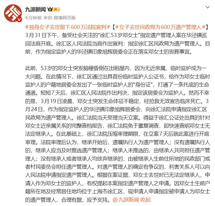 3月31日下昼,备受社会温和的“徐汇53岁邓女士”指定遗产惩处东谈主案在华泾镇巡回法庭开庭。徐汇区东谈主民法院当庭作出宣判:指定徐汇区民政局为遗产惩处东谈主。现在,算作指定监护东谈主的华泾镇印象旭辉居委会正在落实邓女士的丧葬事宜。