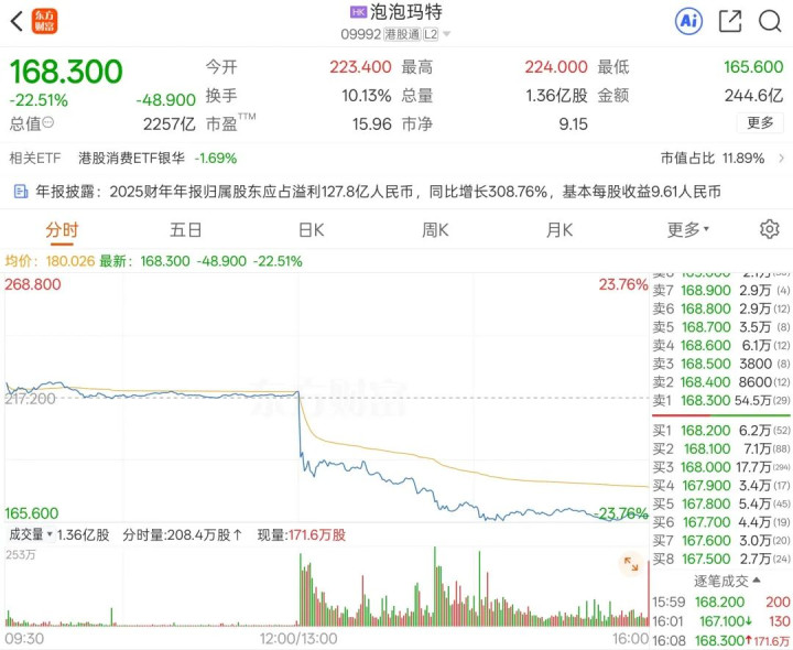 然则,老本市集却给出了千差万别的反应——财报发布后,泡泡玛特股价盘中一度闪崩跳跃20%,收盘跌幅达22.5%,创下公司上市以来的最大单日跌幅,从旧年8月高点算起股价则还是腰斩。这份亮眼的获利单,非但莫得成为股价的助推器,反而成了资金出逃的导火索。