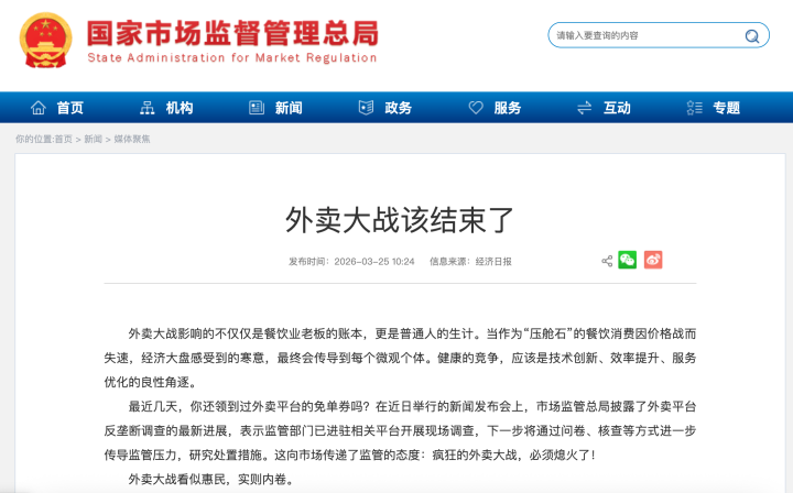 音书面上,国度阛阓监督管制总局官网转发经济日报批驳著作《外卖大战该末端了》。著作称“在近日举行的新闻发布会上,阛阓监管总局线路了外卖平台反把持看望的最新推崇,暗意监管部门已进驻关系平台开展现场看望,下一步将通干扰卷、核查等样式进一步传导监管压力,不息贬责措施。这向阛阓传递了监管的格调:落拓的外卖大战,必须熄火了。”