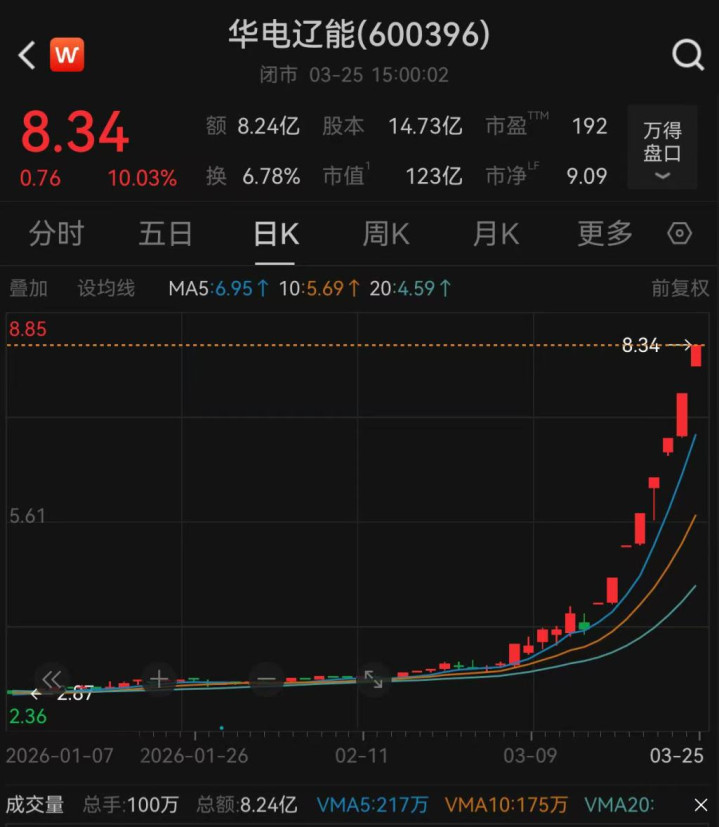其中,华电辽能今早开盘2分钟再度直线拉升涨停,一举刷新此前由年内电力板块领涨标杆豫能控股创下的7连板记载,进而带动阛阓短线心情进一步回暖。放纵收盘,华电辽能报8.34元/股,总市值122.82亿元。自3月16日以来,华电辽能累计涨幅近115%。