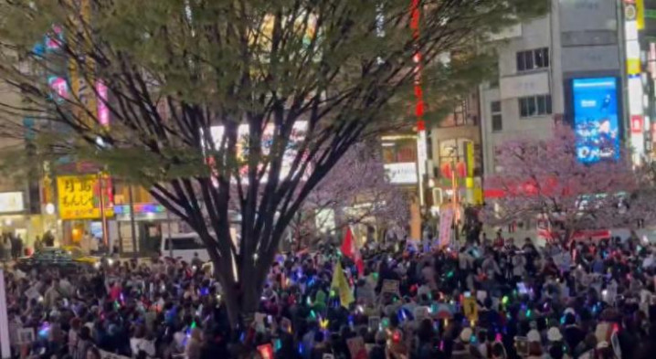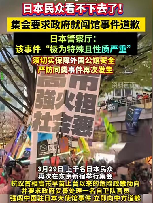 3月28日晚约1400名日本大师冒雨举行大限制反战抗议蚁集,现场东说念主群举着“看护和平宪法”“高市下台”的口号,用日语与汉文都声高喊:“高市说念歉!”“小泉(着巨大臣)说念歉!”“中国抱歉!”