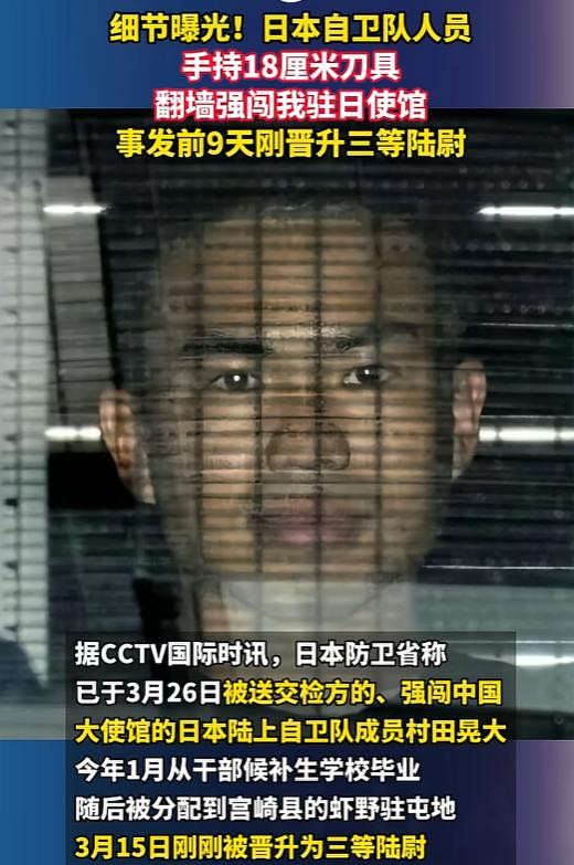 3月24日23岁的日本陆上自保队三等陆尉村田晃大,从使馆相邻建筑4楼翻越带铁丝网的围墙,强行闯入使馆馆舍中枢区域。
