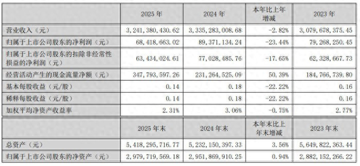 2026 年 3 月,深圳市纺织 (集团) 股份有限公司(股票简称:深纺织 A,股票代码:000045、200045)发布 2025 年年度敷陈。敷陈清楚,公司全年已矣交易收入 32.41 亿元,同比下落 2.82%;包摄于上市公司股东的净利润 6841.87 万元,同比下落 23.44%;包摄于上市公司股东的扣除非经常性损益的净利润 6343.40 万元,同比下落 17.65%;基本每股收益 0.14 元。尽管受行业竞争加重等身分影响功绩有所波动,但公司聚焦偏光片中枢主业,通过居品结构优化、本领鼎新冲破等举措,已矣了方向郑重发展。
