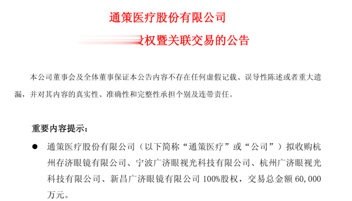 2026年3月24日晚间,通策医疗(600763.SH)发布公告,拟以自有资金6亿元收购杭州存济眼镜有限公司、宁波广济眼视光科技有限公司、杭州广济眼视光科技有限公司、新昌广济眼镜有限公司4家公司100%股权。
