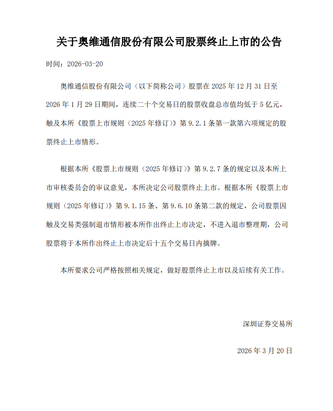 凭证深交所3月21日下发的《对于奥维通讯股份有限公司股票闭幕上市的决定》,公司股票在2025年12月31日至2026年1月29日历间,相接二十个往返日的股票收盘总市值均低于5亿元,涉及《深圳证券往返所股票上市功令(2025年雠校)》第9.2.1条第一款第六项限定的往返类强制退市情形。深交所据此决定公司股票闭幕上市,且因涉及往返类强制退市,不投入退市整理期,将于作出闭幕上市决定后十五个往返日内径直摘牌。