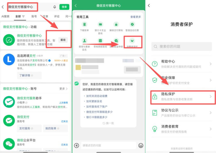 通达微信之后,点一下右上角的【放大镜】,在输入框中输入“微信支付客服中心”,在搜索出来的后果中,点击【前去】,插足之后,选拔【耗尽者保护】,然后找到【诡秘保护】选项。