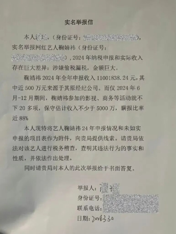 极目新闻记者扫视到,名为“实名举报信”上的履行露出,实名举报者提到,鞠婧祎在2024年全年申报收入1100余万元征税,但“仅2024年6月-12月期间,鞠婧祎干预的影视、商务等行径就不下20多项,保守揣度收入不少于5000万。”举报东说念主称,鞠婧祎瞒报比率达88%。