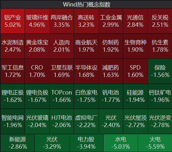 从板块来看,有色金属、农业、化工、军工、医药板块走强,CPO、贸易航天、黄金、鼎新药、两岸交融主意股活跃;电力股大跌,华电动力、晋控电力跌停,银星动力、宁波动力等多股波及跌停;光伏、锂电板题材走弱。