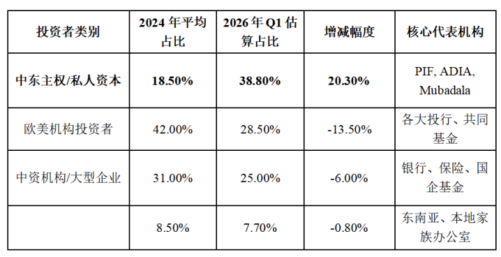 在一级市集,中东老本已成为港股IPO的“计谋压舱石”。2026年第一季度,中东主权基金在港股IPO中的基石投资参与比例从2024年的不及20%猛增至38.8%。布局的标的包括,东说念主工智能(AI)、生意航天及新动力等中枢畛域。通过投资香港上市的科技公司,筹商那时间向中东调养,作事其国内“2030愿景”的去石油化转型。